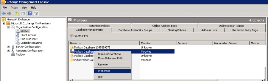 – Next click on ‘Mailbox’, this will show all the mailbox databases on the exchange server, you want to select the mailbox database that’s mounted