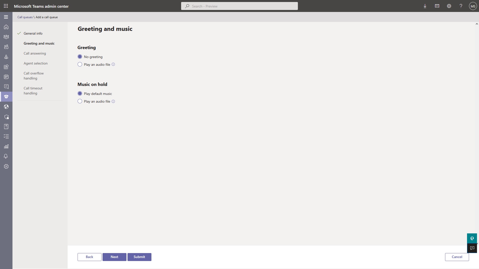 Click on next and on the next screen choose if you want to play a message our hold music. IF required you can upload your companies hold music to this call queue in wav file format.